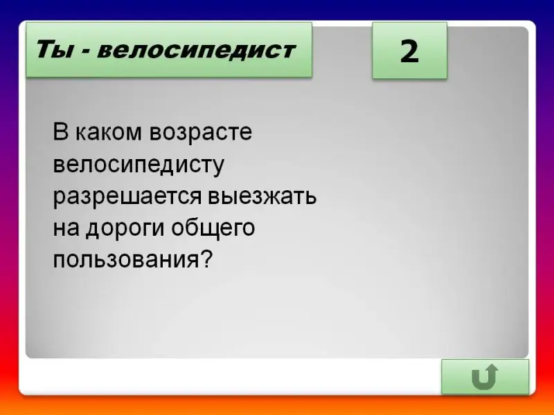 - В каком возрасте велосипедисту разрешается выезжать на дороги общего пользования? (С 14 лет)