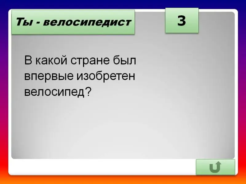 - В какой стране мира впервые был изобретен велосипед? (Во Франции)