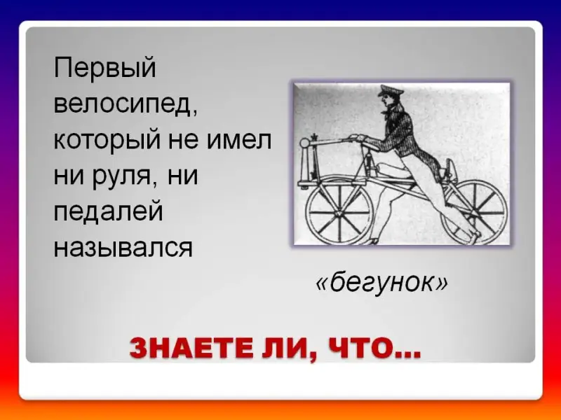 … первый велосипед, который не имел ни руля, ни педалей назывался «бегунок» (слайд 25)