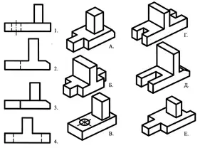 Установите соответствие главных видов, обозначенных цифрами, деталям, обозначенным буквами, и запишите ответ в тетради.