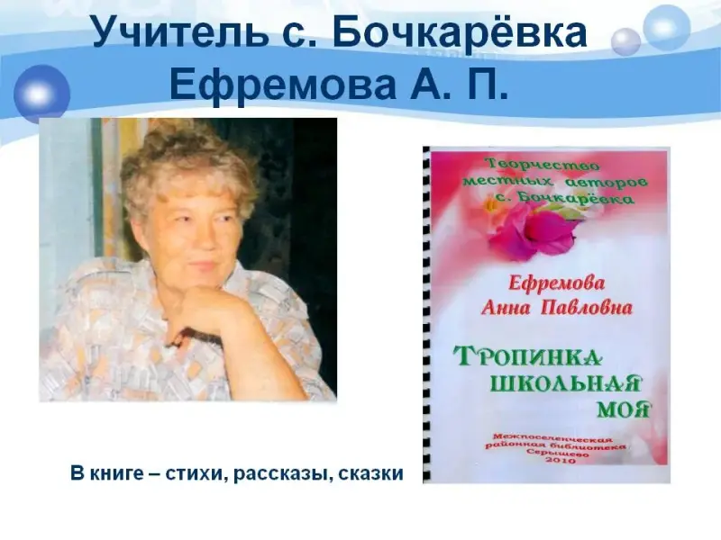 - читали рассказы, сказки и стихи учительницы из Бочкарёвской школы (слайд 3) Ефремовой Анны Павловны из вышедшей летом прошлого года книги «Тропинка школьная моя»;