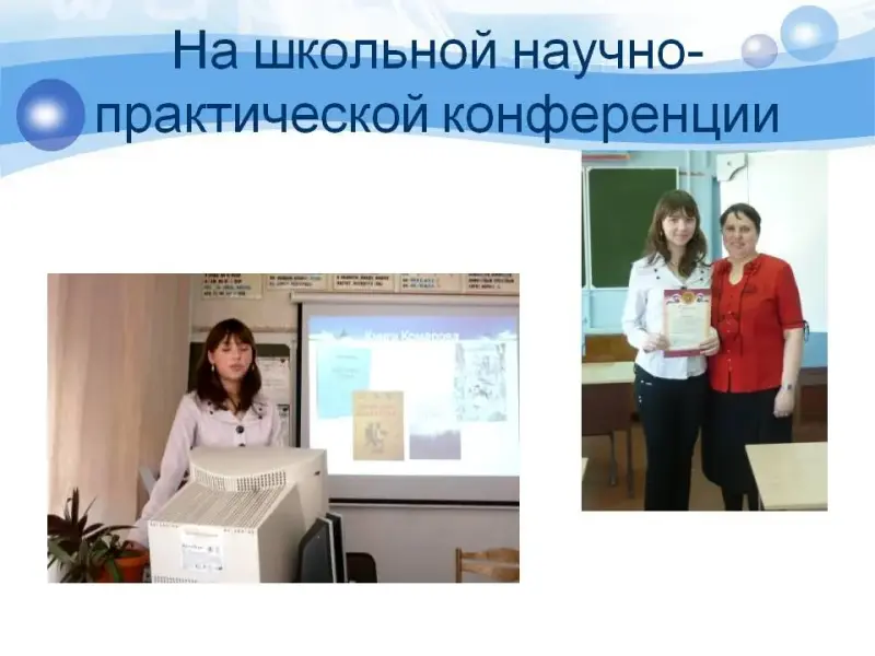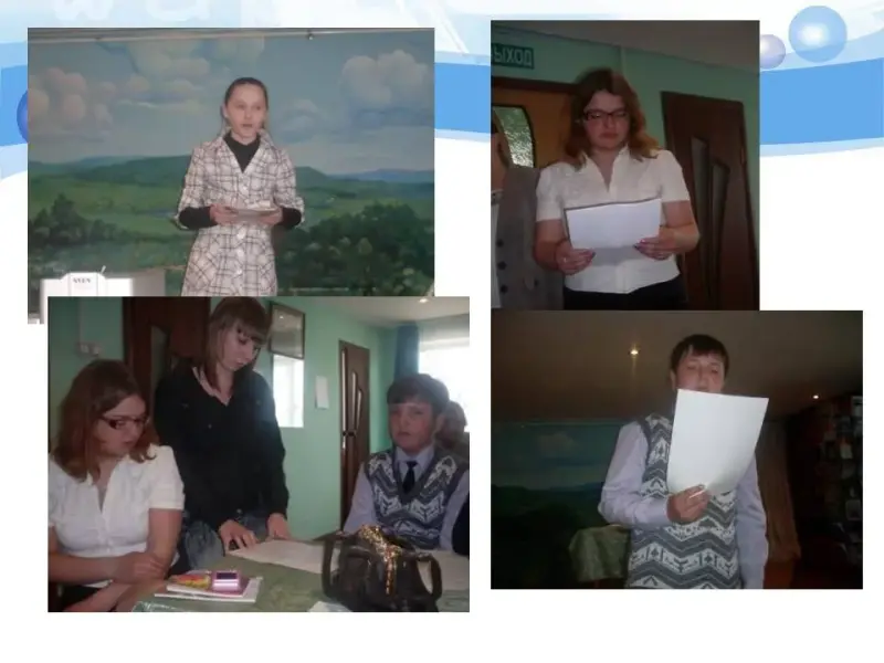 Наши кружковцы, в свою очередь, тоже представили своё творчество (слайд 13): Раков Виктор (8 класс) прочитал сочинённую им для Российского литературного конкурса в честь 130-летия П. Бажова «Сказку о рыбаке дючере и о духе племени», которая заняла 3 место по Амурской области, а Солопенко Ксения (7 класс) рассказала свои стихотворения о грозе и о маме. Читали свои стихи и одиннадцатиклассницы Кубрак Евгения и Матвеева Наталья.