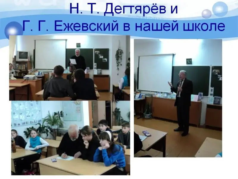 Вместе с Н. Т. Дегтярёвым приезжал и Геннадий Генрихович Ежевский - он тоже выступал перед нами, обещал приехать ещё и петь с нами свои песни.