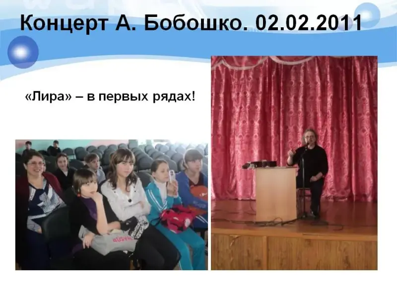 Почти всем кружком мы присутствовали на концерте известного амурского барда Александра Бобошко! (слайд 8) Он исполнял свои песни, читал сатирические стихи о том, какими не надо быть, беседовал с нами, а в конце спел вместе с нами песню «Фестивальная». Было здорово!