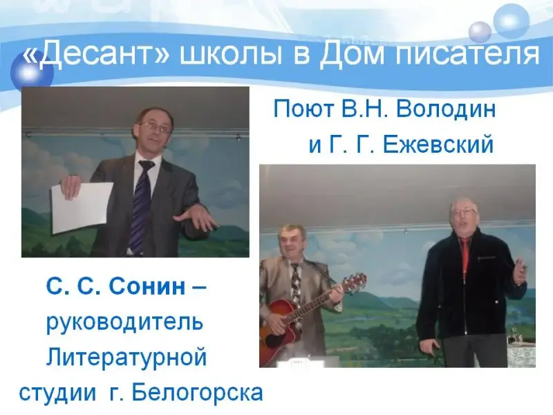- лучше узнали творчество белогорских поэтов и писателей(слайд 4), членов Литературной студии, созданной 5 лет назад Сергеем Сергеевичем Сониным.