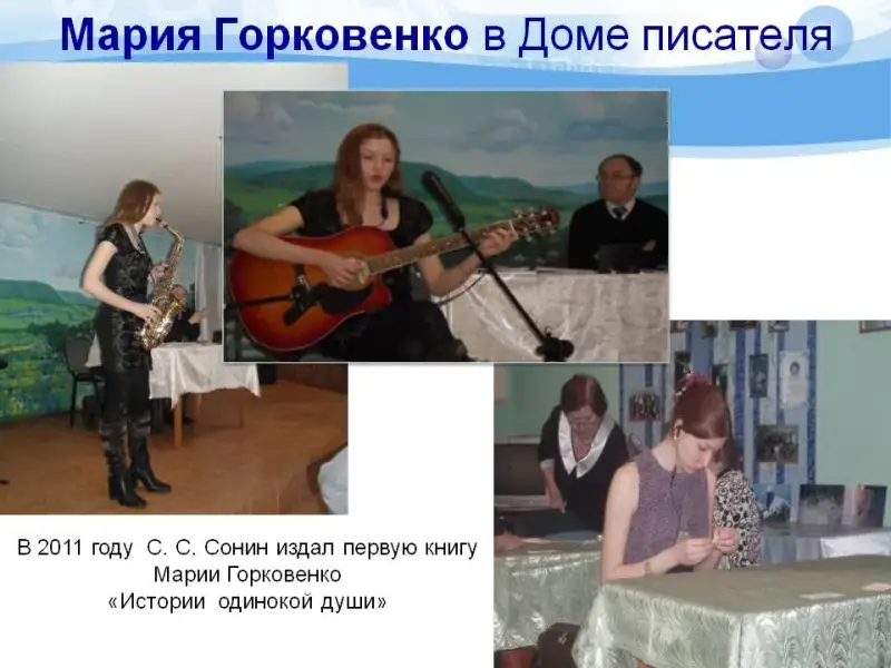 В литературной студии мы встретились с выпускницей нашей школы 2009 года Марией Горковенко (слайд 12), первую книгу которой выпустил Сергей Сергеевич Сонин в начале этого года. Эта книга есть в школьной библиотеке. Сейчас уже готовится к изданию вторая книга.