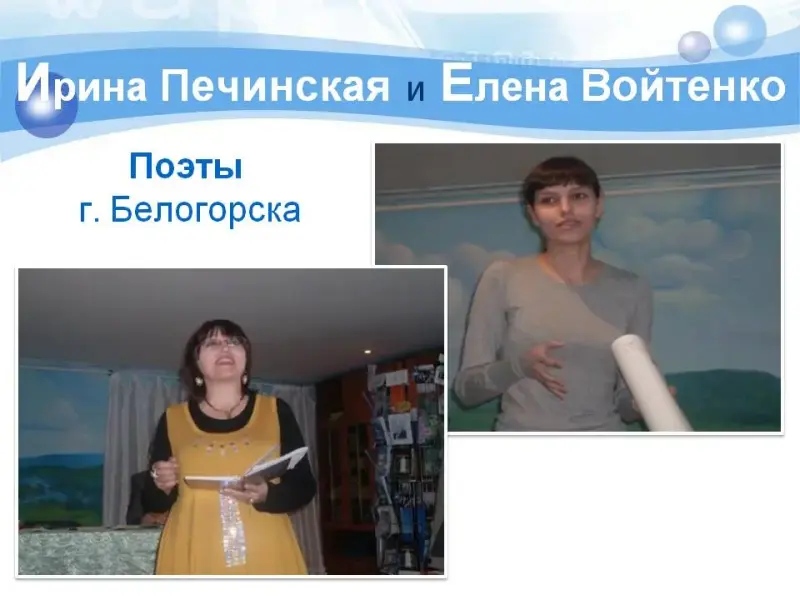 Всем понравилось, как страстно выступила перед учениками нашей школы Елена Войтенко, член Союза писателей России с ноября прошлого года (а ей всего 22 года!). (слайд 14) Елена прочитала своё стихотворение о том, как трудно порой бывает людям у нас в стране. А Ирина Печинская специально для нас читала стихи, написанные ей в детстве.