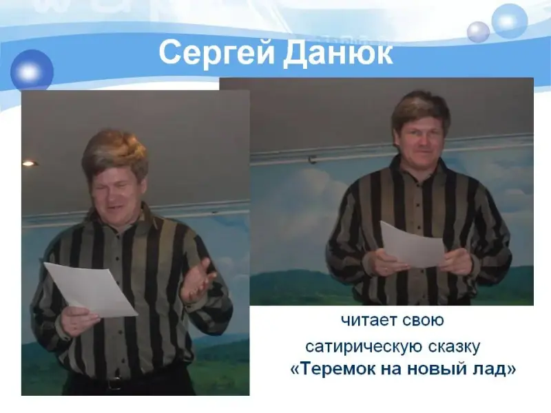 Особое впечатление произвёл на всех Сергей Данюк (слайд 15). Он так зажигательно и артистически прочитал свою сатирическую сказку «Теремок на новый лад», что мы изрядно повеселились! Сергей Данюк обещал приехать в нашу школу.