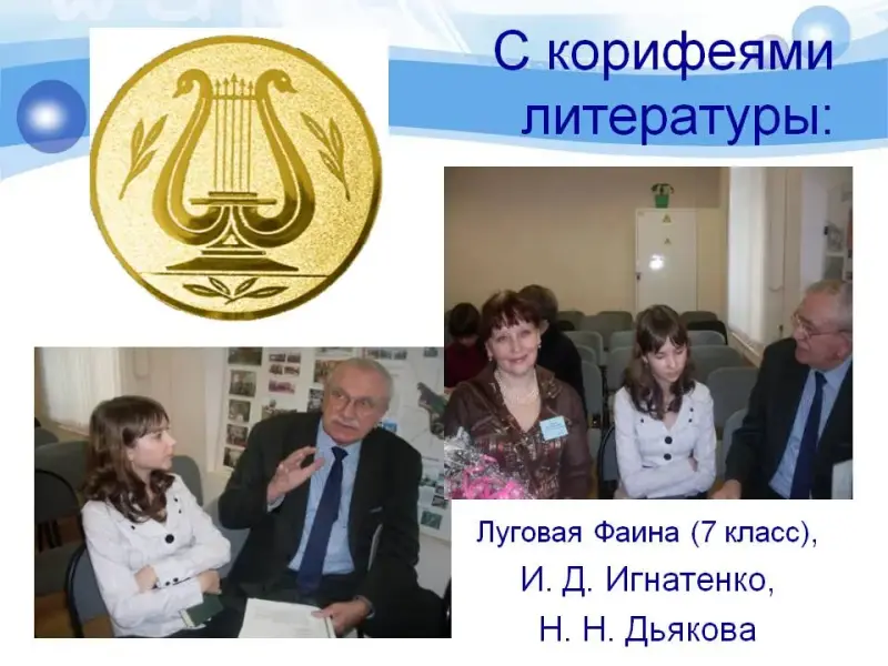 На весенних каникулах самый активный и творческий член кружка «Лира» приняла участие в областном литературном семинаре «Серебряная лира» (слайд 18: открытие семинара - Луговая Фаина со своим руководителем Черныш Ю. Г. в первом ряду; перед семинаристами выступают члены Союза писателей России Елена Войтенко, Владислав Лецик и Николай Левченко).