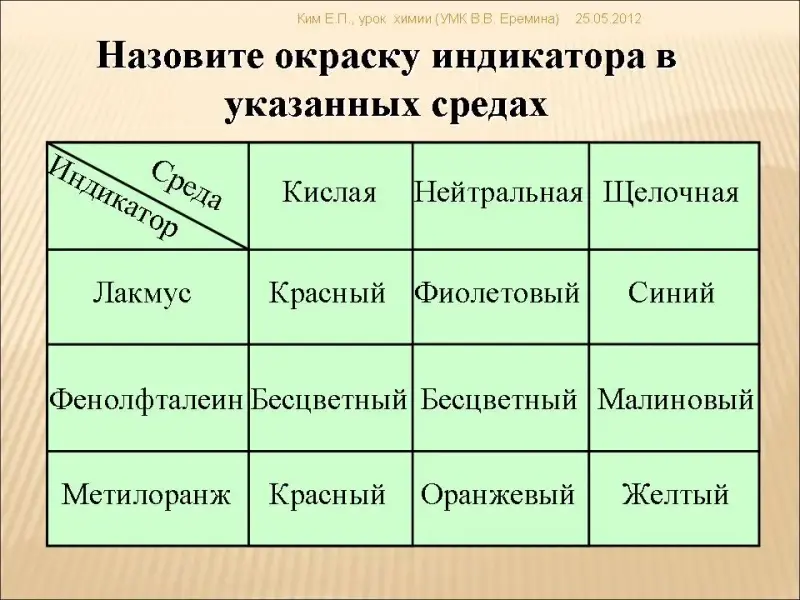 Ребята, вспомните, пожалуйста, какие вещества называются индикаторами? Назовите известные вам индикаторы и охарактеризуйте их поведение в различных средах. Работа со слайдом №7, содержащим триггеры (цвет и надпись окраски индикатора появляются по щелчку мыши после высказанных предположений учащихся):