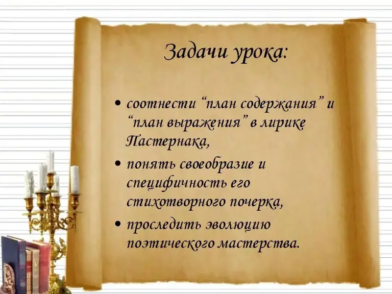 Сегодня на уроке мы попытаемся соотнести "план содержания" и "план выражения" в лирике Пастернака, понять своеобразие и специфичность его стихотворного почерка, проследить эволюцию поэтического мастерства.