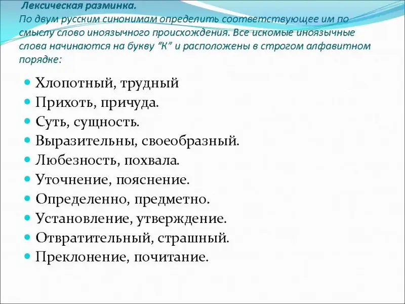 - По двум русским синонимам определить соответствующее им по смыслу слово иноязычного происхождения. Все искомые иноязычные слова начинаются на букву “К” и расположены в строгом алфавитном порядке. (Слайд 5)