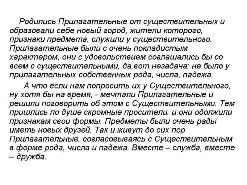 Родились Прилагательные от существительных и образовали себе новый город, жители которого, признаки предмета, служили у существительного. Прилагательные были с очень покладистым характером, они с удовольствием соглашались бы со всем с существительными, да вот незадача: не было у прилагательных собственных рода, числа, падежа.