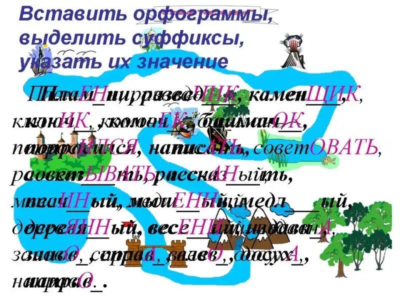 Вставить орфограммы, выделить суффиксы, указать их значение