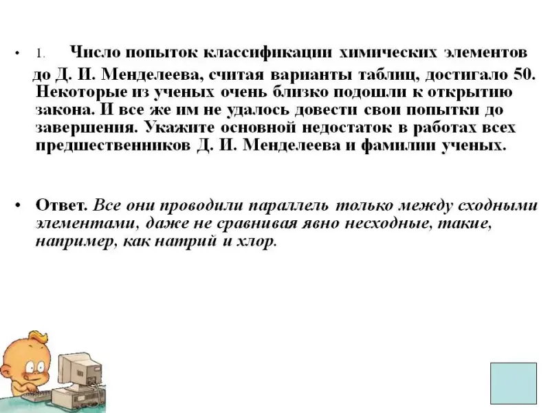 1.Число попыток классификации химических элементов до Д. И. Менделеева, считая варианты таблиц, достигало 50. Некоторые из ученых очень близко подошли к открытию закона. И все же им не удалось довести свои попытки до завершения. Укажите основной недостаток в работах всех предшественников Д. И. Менделеева и фамилии ученых. Все они проводили параллель только между сходными элементами, даже не сравнивая явно несходные, такие, например, как натрий и хлор.