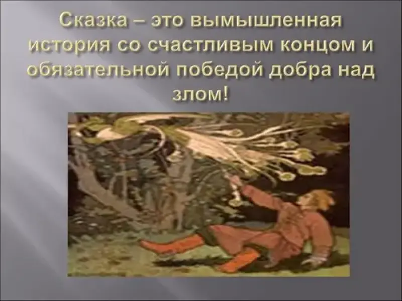 Ведущий: Сказка - это вымышленный рассказ, небывалая, даже несбыточная повесть или сказание. Сказка - это вымышленная история со счастливым концом и обязательной победой добра над злом.