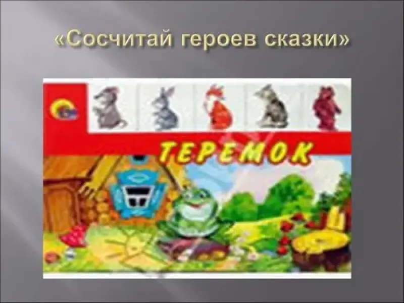 "Теремок" - 8 героев (муха, комар - пискун, мышка - погрызуха, лягушка, заяц, лиса, волк, медведь). Слова: - Чей домок-теремок? Кто в тереме живет? Я, муха-горюха. Я, комар-пискун. Я мышка-погрызуха. Я, лягушка-квакушка. Я, заюнок-кривоног, по горке скок. Я, лиса - при беседе краса. Я, волк-волчище - из-за куста хватыш. А ты кто? Я вам всем пригнетыш.