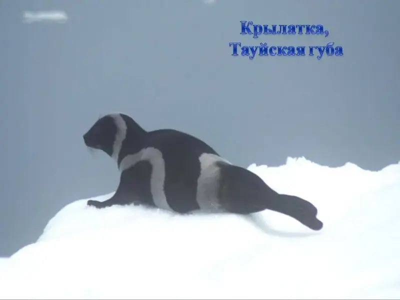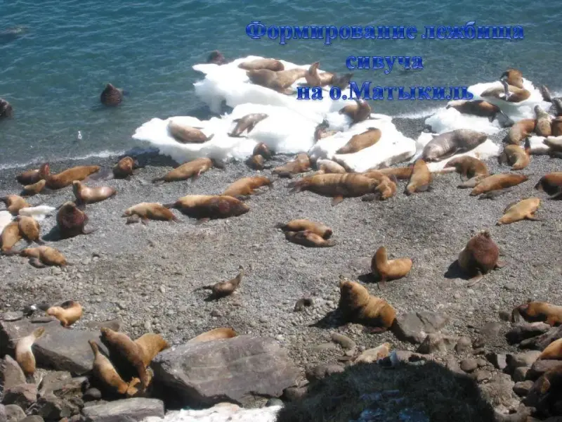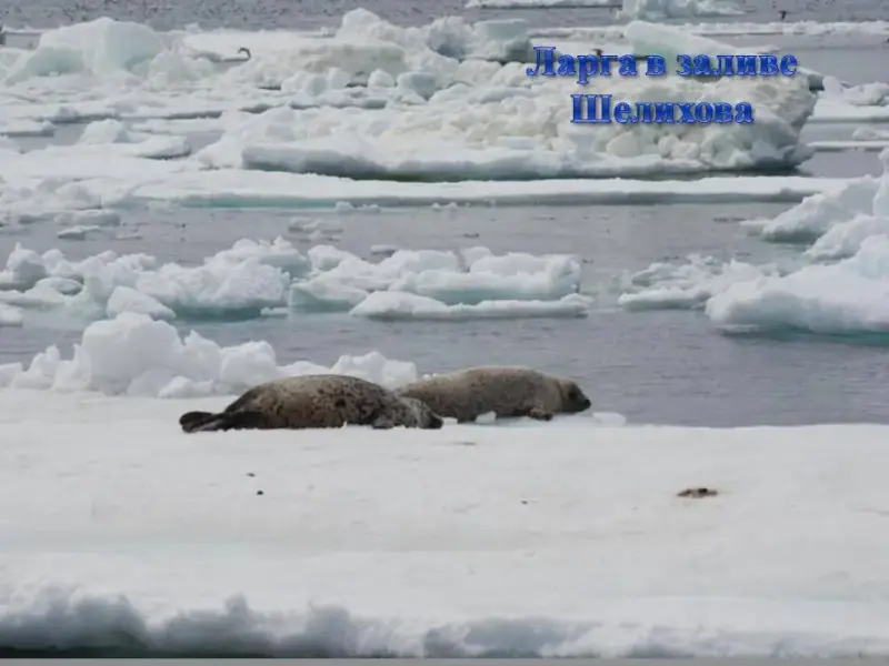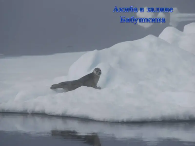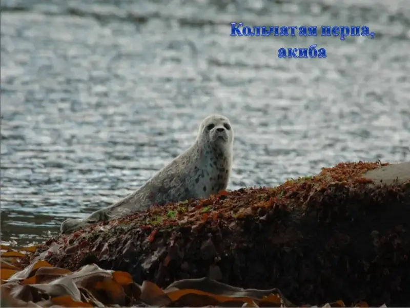 СЛАЙД 5. Конец весны, море освобождается ото льда. На плавающих льдинах можно увидеть тюленей. Акиба небольшой тюлень. Длина тела составляет 1,1 - 1,4м. Обитает преимущественно в прибрежной зоне, питается мелкой рыбой и ракообразными.