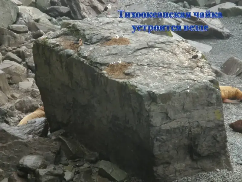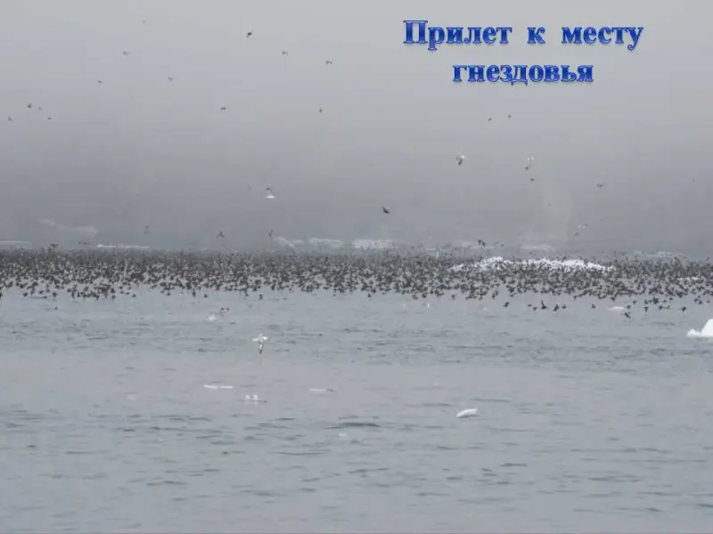 СЛАЙД 9. Начинается весенний прилет птиц к месту гнездовий. Видов, образующих птичьи базары немного. Это чайки, кайры, конюги, топорки, чистики, глупыши, бакланы. Вся их жизнь связана с морем, но в начале весны они стремятся к побережью.
