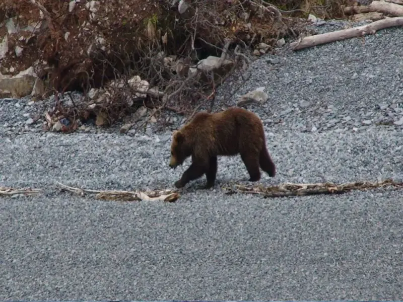 СЛАЙД 13. Море все больше очищается ото льда. Теперь можно подойти к берегу и понаблюдать за жизнью других обитателей. Природа начинает свое пробуждение после зимы. Медведи собираются на побережье в поисках пищи. В это время можно увидеть самку с медвежатами. Бурый медведь один из крупных наземных хищников. Весной питается почками березки, хвощом, морской капустой, падалью.
