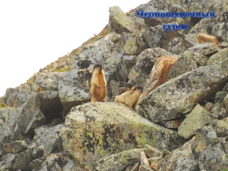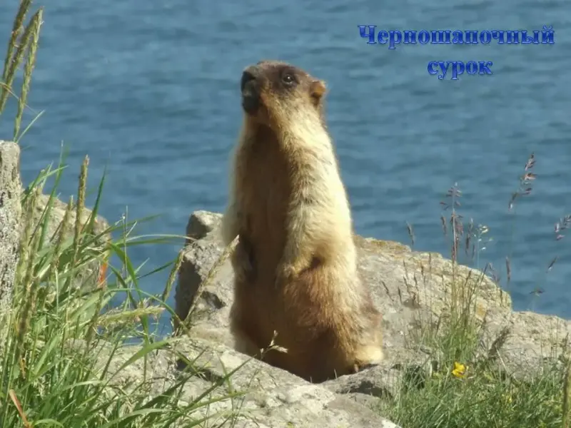 СЛАЙД 14. Черношапочный сурок выбрался из своей норы и осматривает окрестности. Собой он напоминает суслика, но гораздо крупнее до 3 - 4кг. Питается травянистой растительностью.