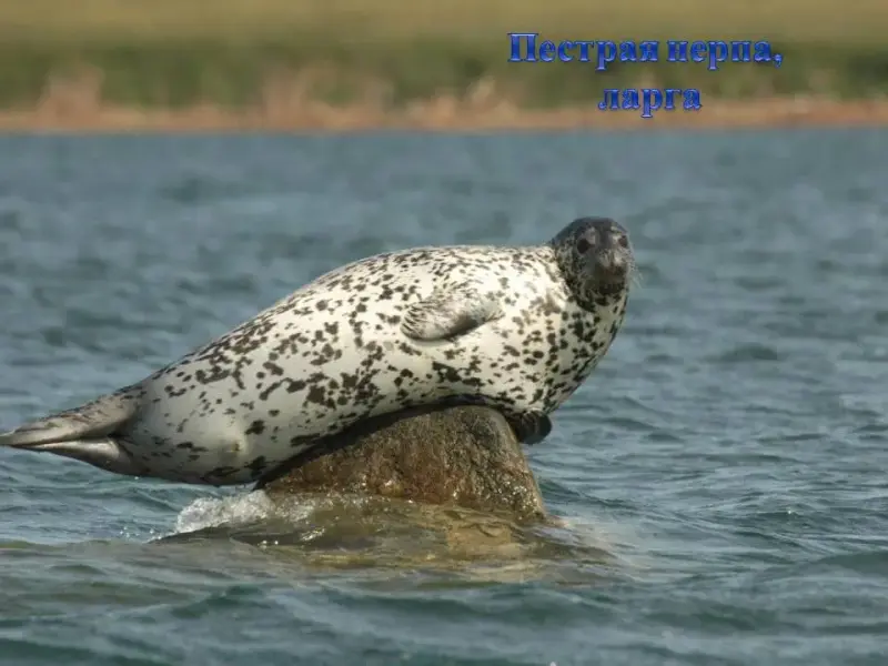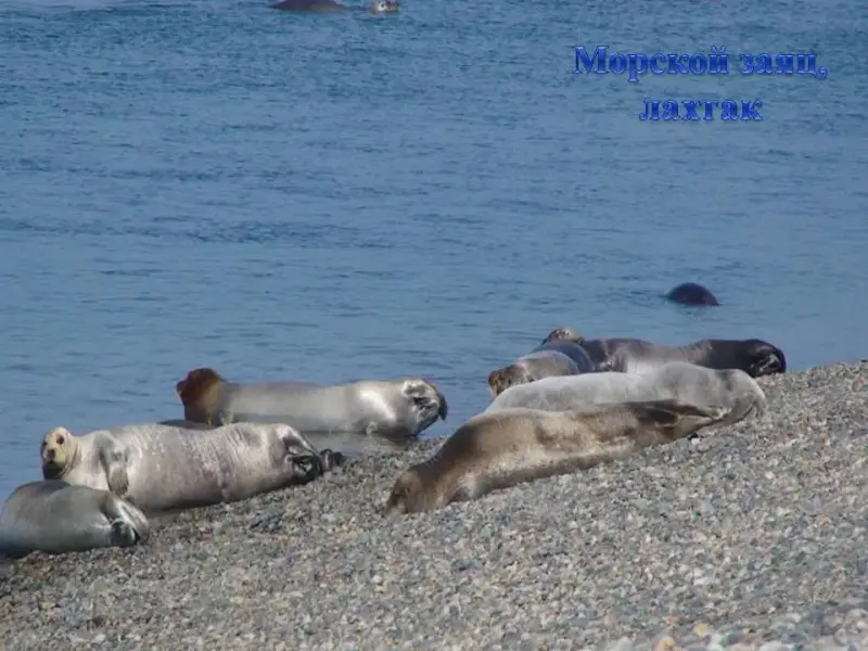 СЛАЙД 7. Лахтак держится в мелководной зоне, питается беспозвоночными и рыбой. Длина тела составляет 2 - 2,3м.