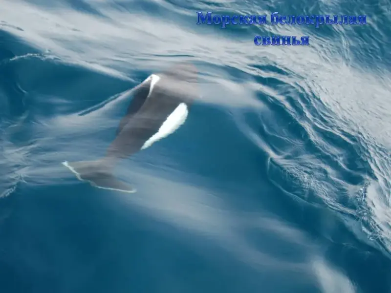 СЛАЙД 36. В это время недалеко от берега можно встретить быстроходных дельфинов - морскую белокрылую свинью. Группы по 10 -20 особей. Питаются моллюсками и рыбой. В длину могут достигать до 2м.