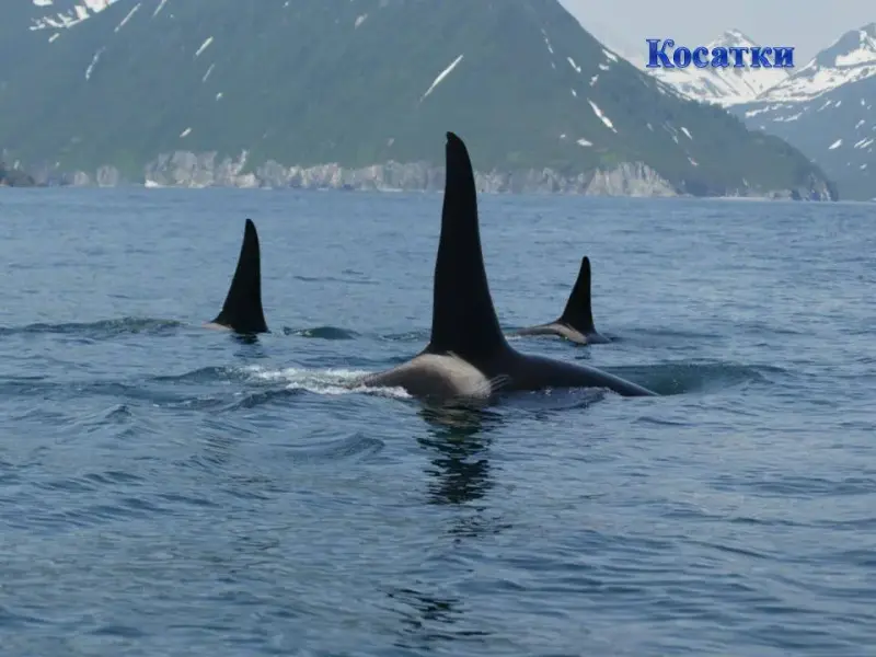 СЛАЙД 37. Касатки держатся семейными группами. Настоящий хищник. Их можно увидеть рядом с берегом, когда они проплывают и кормятся. Доминирующая пища - рыба, головоногие моллюски и морские млекопитающие. В длину самцы могут быть до 10м.