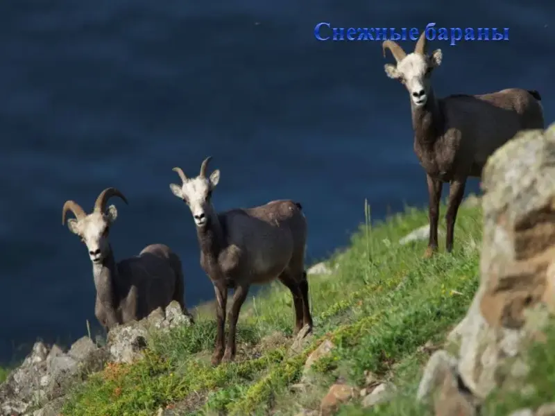 СЛАЙД 39. На склонах гор снежные бараны кормятся злаками, побегами кустарничков, мхами и грибами. В поисках солонцов появляются на морском берегу. Длина тела самцов достигает 178см, высота в холке 107см.
