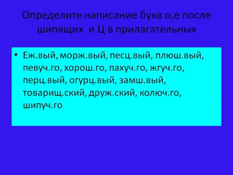 Слайд №12. «Определите написание букв о, е после шипящих и ц в прилагательных».