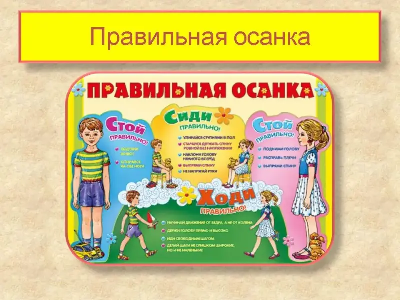 - Для чего нужна правильная осанка? (У детей кости гибкие. Если сутулиться, неровно сидеть за столом, позвоночник искривится и не будет ровно держать наше тело.)