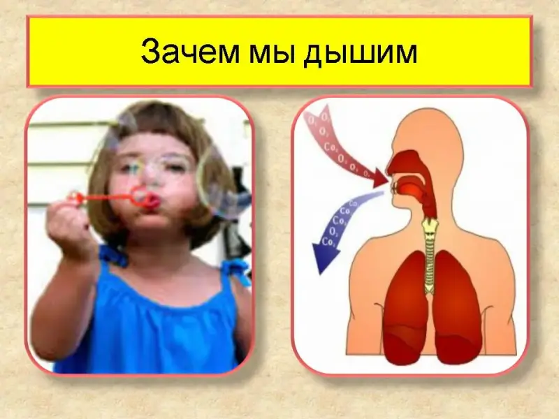 - Зачем человек дышит? (Человеку для жизни нужен кислород, а он попадает к нам из воздуха во время дыхания.)