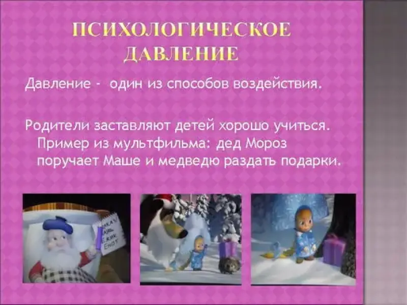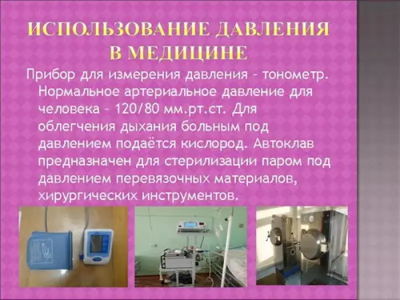 3-й ученик. (Слайд № 5) Все знакомы с понятием артериальное давление. В больнице имеются приборы для измерения данной характеристики - тонометры. Нормальное давление для человека - 120/80 миллиметров ртутного столба. Значения больше и меньше этого числа отрицательно сказываются на здоровье человека. Для облегчения дыхания больным под давлением подаётся кислород. В медицине используется стерилизатор паровой, который предназначен для стерилизации паром под давлением перевязочных материалов, операционного белья, хирургического инструмента. На человека может оказываться психологическое давление: родители заставляют хорошо учиться, а Машу и медведя из мультфильма дед Мороз отправил разносить подарки. (Слайд № 6)