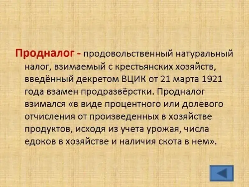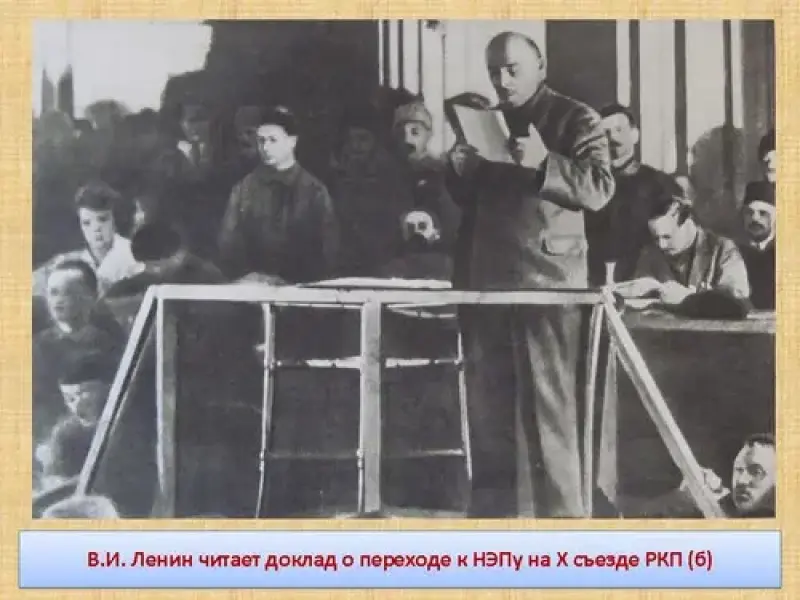 Учитель: На Х съезде РКП(б) В.И. Ленин объявил о замене продразвёрстки продналогом и о переходе к новой экономической политике.(Слайд № 10 - 12.) Речь учителя 5 минут