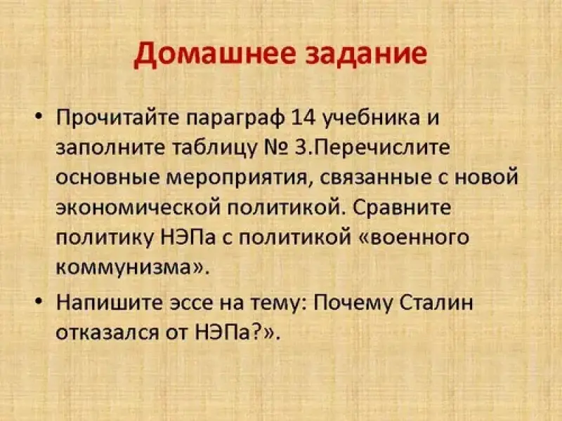 Учитель: Сегодня мы познакомились с новой экономической политикой партии большевиков. Безусловно, это был вариант выхода из сложившейся кризисной ситуации. Ленин это понимал, хотя нэп и противоречил большевистским канонам. Из истории мы сегодня знаем, что данная политика оказалась эффективной всего первые пять лет. Действительно повысился жизненный уровень, сократился рабочий день, продразверстка была заменена продналогом и т.д., но НЭП не смог привлечь иностранный капитал в страну, а без денежных средств в стране не хватило.