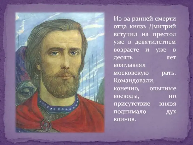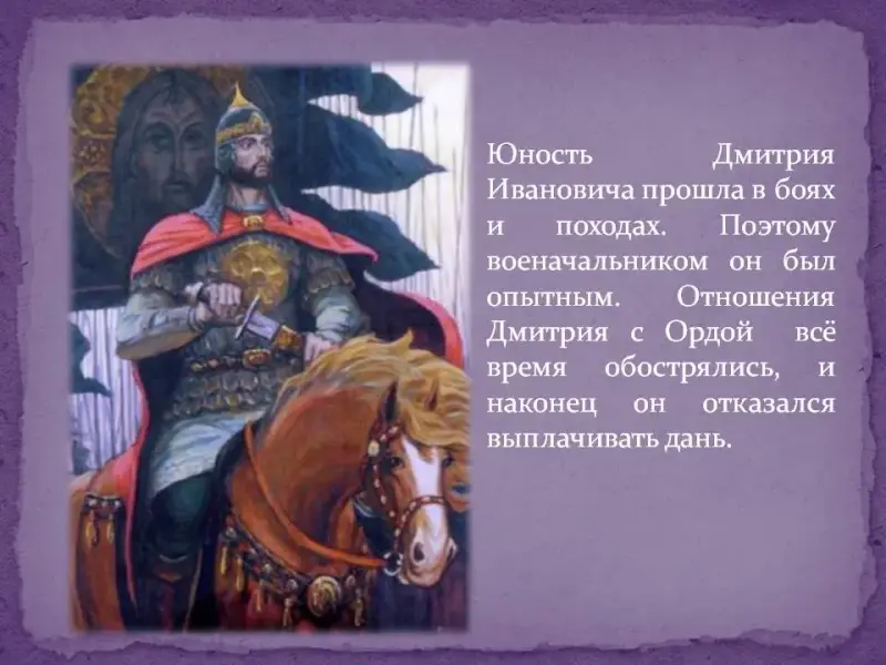 Из-за ранней смерти отца князь Дмитрий вступил на престол уже в девятилетнем возрасте и уже в десять лет возглавлял московскую рать. Юность Дмитрия Ивановича прошла в боях и походах. Поэтому