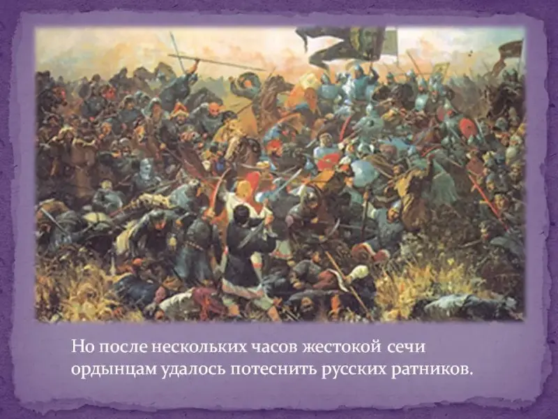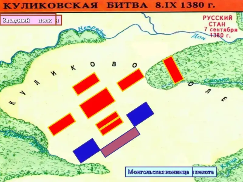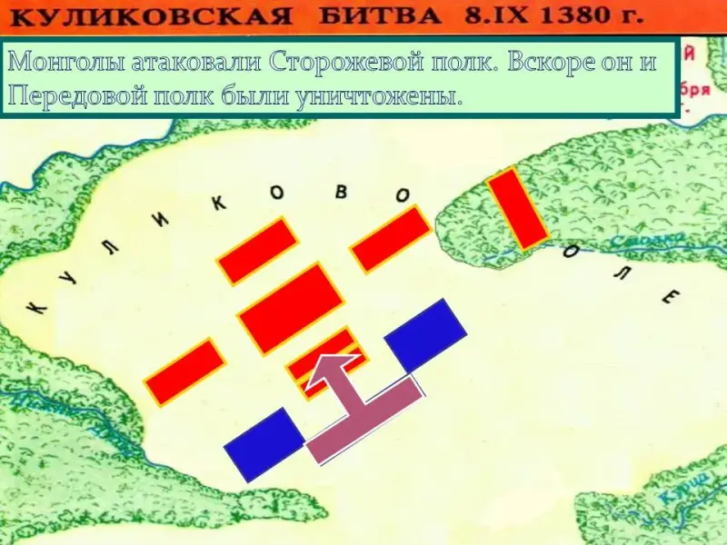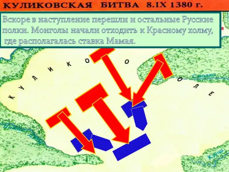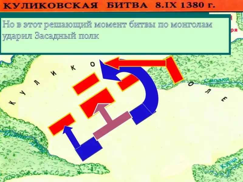 удар на полки право и левой руки. Полк левой руки стал отступать к реке Непрядве, что угрожало русским полкам полным окружением, а засадный полк в это время ждал удобного момента… В решающий момент