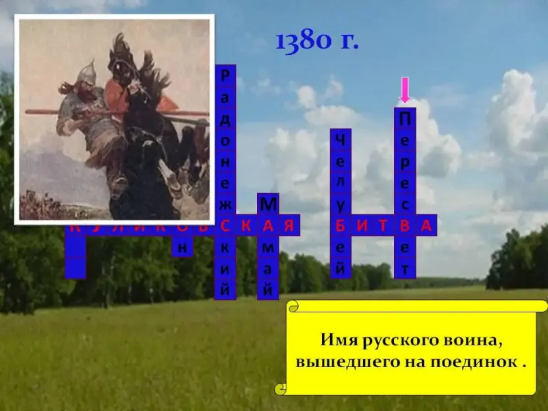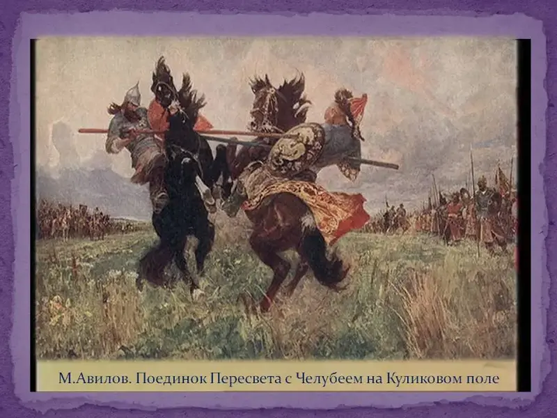 Пересвет. С копьями наперевес помчались они навстречу друг другу, на всем скоку столкнулись, поразив насмерть друг друга копьями и оба погибли.