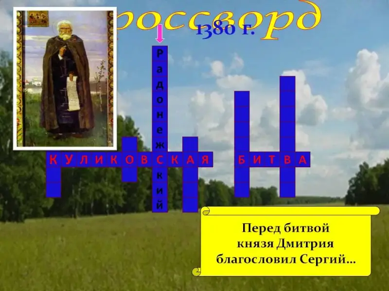 - на примере Сергия Радонежского показать роль православной церкви в обеспечении победы на Куликовом поле;
