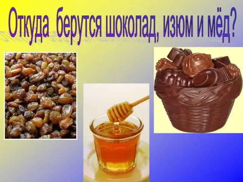 - Ребята, расскажите дома, откуда берутся шоколад, изюм и мёд.