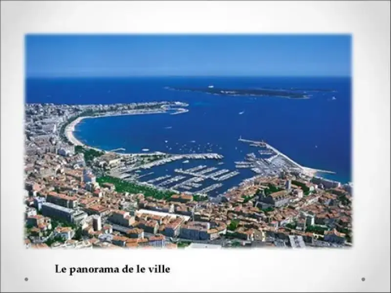 Cannes est la capitale cinématographique. Cannes est aujourd'hui mondialement connue pour son festival du film et sa promenade de la Croisette bordée de palaces.Chaque année le festival de cinéma a lieu à Cannes au mois de mai. Alors, on peut voir ici les artistes célèbres du monde entier. Cette ville se trouve au bord de la Méditerranée, elle est renommée aussi pour ses plages et ses paysages.