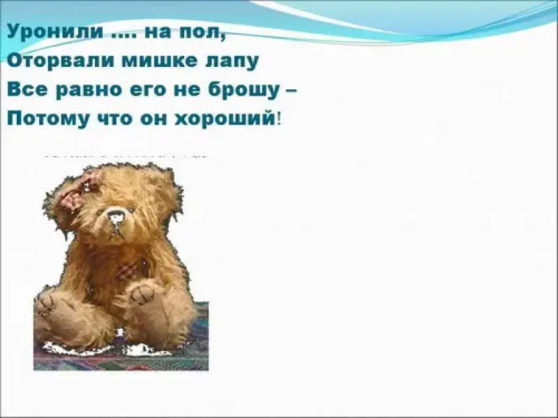 - Вспомните начало урока. Какими строчками из стихов А.Л.Барто можно ответить на этот вопрос? (Всё равно его не брошу, потому что он хороший!)
