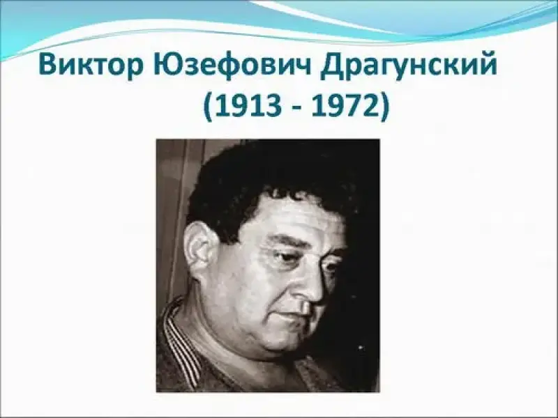 - У меня в руках книга (показ книги "Денискины рассказы"), автором которой является Виктор Юзефович Драгунский (слайд 8). В детстве он был обычным ребёнком, любил побезобразничать, похохотать, придумать что-нибудь. Самой любимой книгой его была книжка про Тома Сойера (слайд 9). После школы В. Драгунский работал на заводе токарем, затем шорником, даже был лодочником, катал на лодке людей по Москве-реке у Нескучного сада.