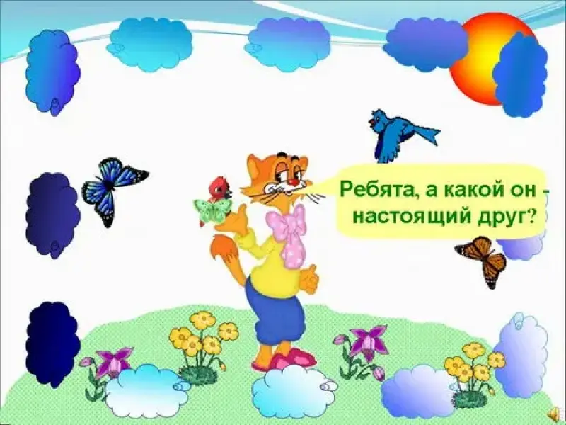Звучит песня о дружбе "Настоящий друг" (слова М. Пляцковского).