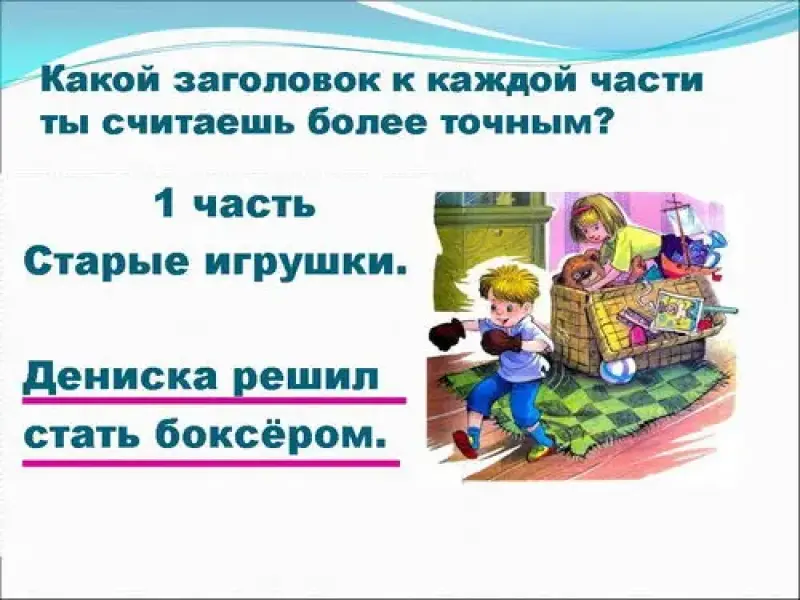 - Выберите наиболее удачный заголовок к каждой части (выполняют в тетради по литературному чтению) (слайды 23 - 24)