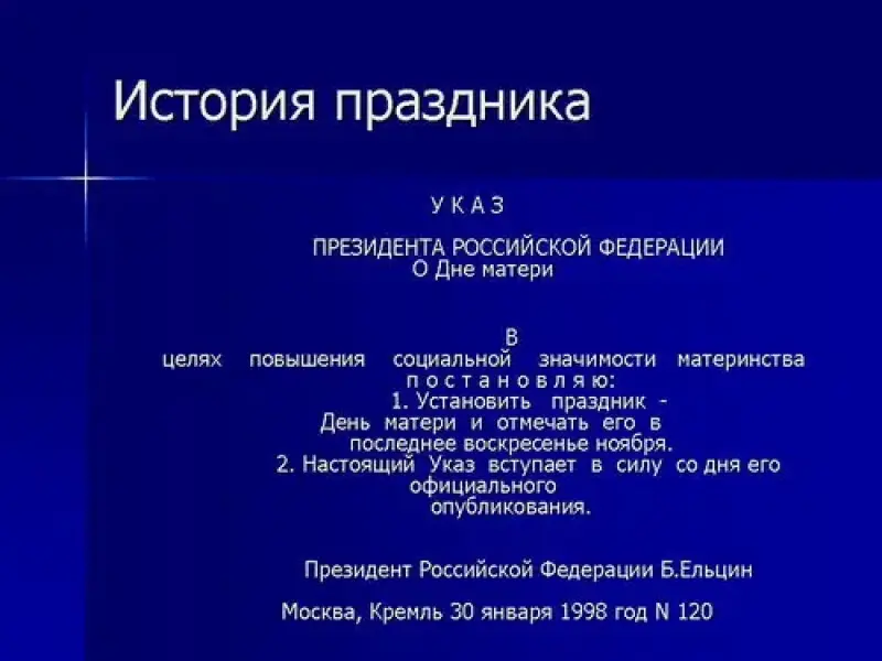1. Установить праздник - День матери и отмечать его в последнее воскресенье ноября.