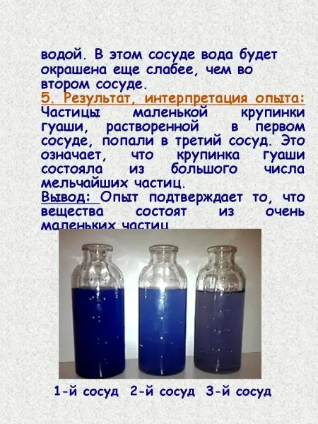 - Результат, интерпретация опыта: Частицы маленькой крупинки гуаши, растворенной в первом сосуде, попали в третий сосуд. Это означает, что крупинка гуаши состояла из большого числа мельчайших частиц.