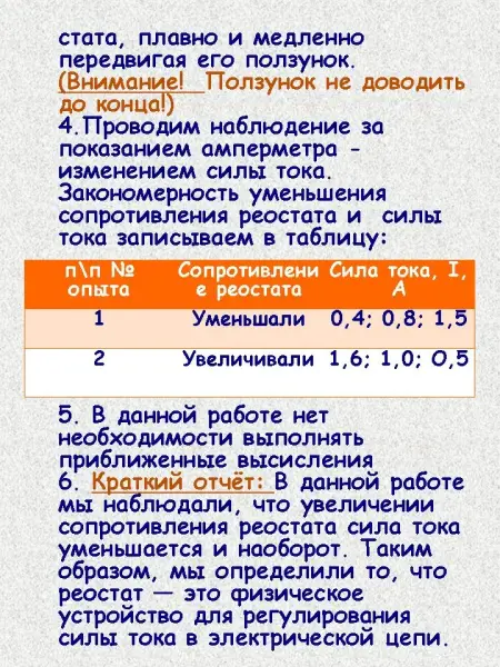 6. Краткий отчёт: В данной работе мы наблюдали, что увеличении сопротивления реостата сила тока уменьшается и наоборот. Таким образом, мы определили то, что реостат - это физическое устройство для регулирования силы тока в электрической цепи.