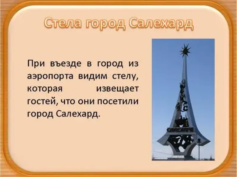 При въезде в город из аэропорта видим стелу, которая извещает гостей, что они посетили город Салехард. (слайд 4)