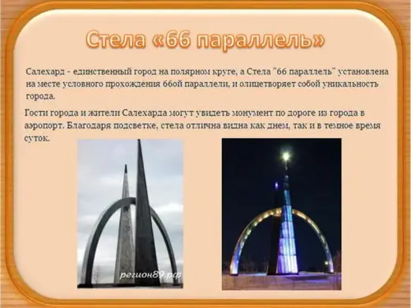 Салехард - единственный город на полярном круге, а Стела "66 параллель" установлена на месте условного прохождения 66-ой параллели, и олицетворяет собой уникальность города. Гости города и жители Салехарда могут увидеть монумент по дороге из города в аэропорт. Благодаря подсветке, стела отлично видна как днём, так и в тёмное время суток. (слайд 5)